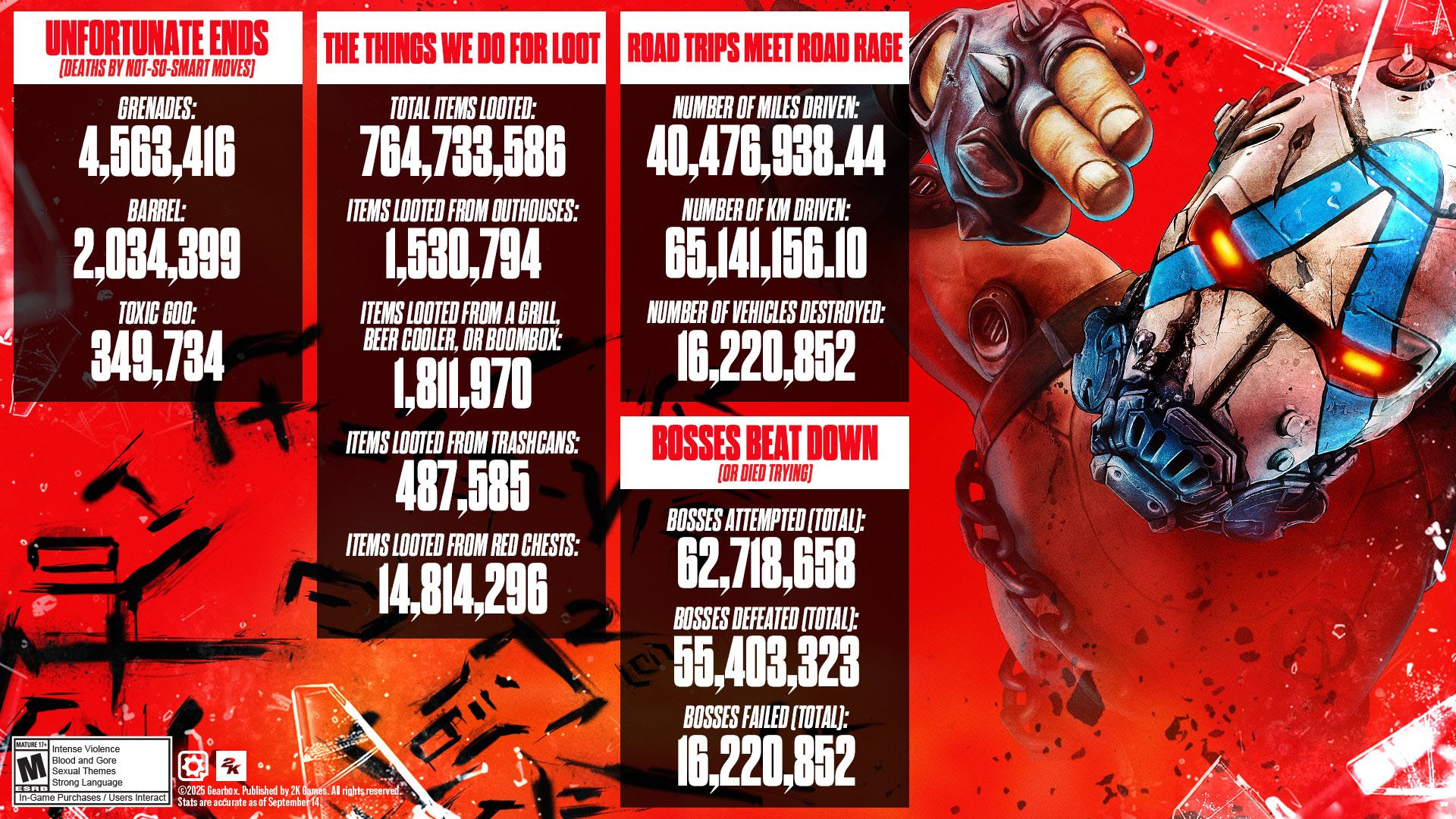 Además de las estadísticas de botín y muertes, el juego ha registrado 16.220.852 vehículos destruidos y 62.718.658 batallas contra jefes iniciadas, de las cuales 55.403.323 terminaron con la derrota del enemigo. Sin embargo, 16.220.852 encuentros contra jefes resultaron fallidos para los jugadores. A pesar de las buenas críticas generales, Borderlands 4 ha enfrentado críticas en PC por problemas de rendimiento, algo que Gearbox está abordando.